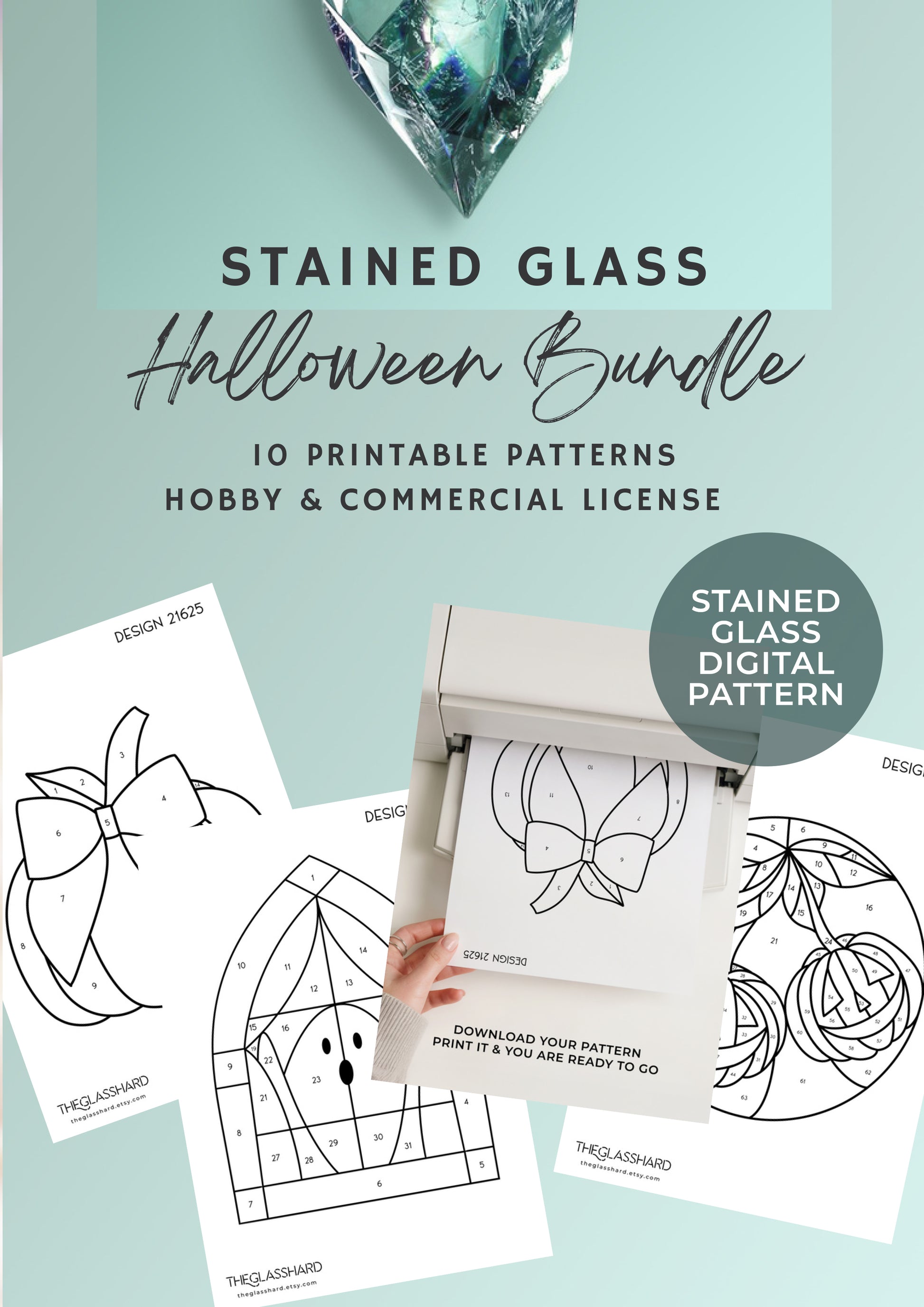 Halloween Bundle - 10 Stained Glass Digital Patterns ready to download and print, to start creating your DIY Stained Glass Decor. All the Patterns are hand drawn.